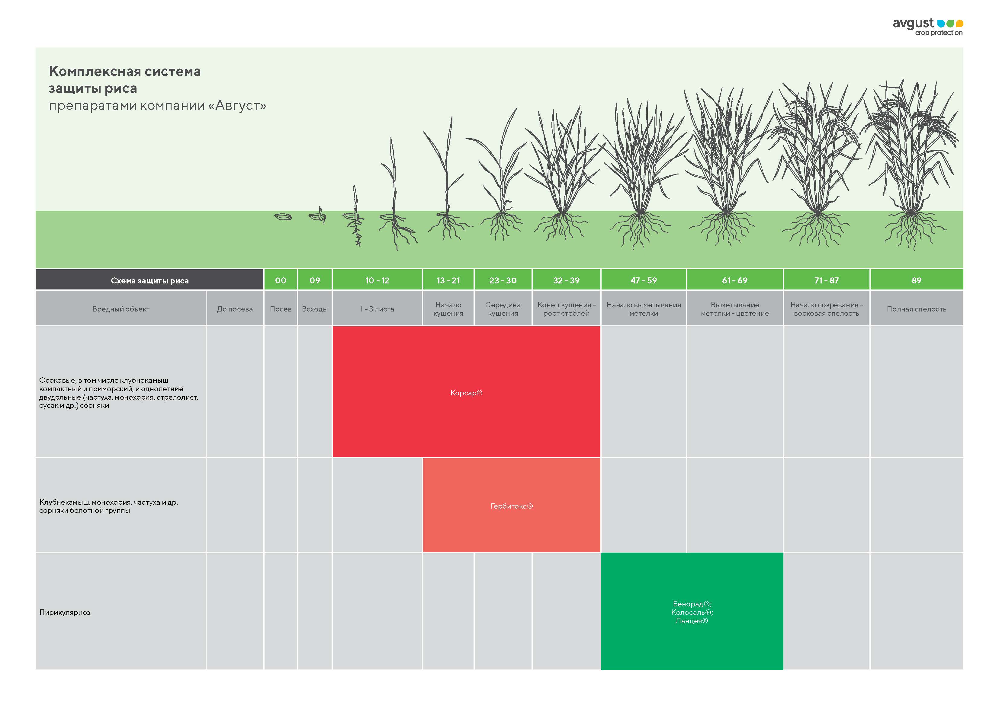 Один из самых актуальных вопросов для аграриев – защита посевов от просовидных сорных растений, в том числе устойчивых к бенсульфурон-метилу. Своевременное и правильное применение гербицидов Корсар и Гербитокс в системе защиты риса обеспечивает прекрасные результаты.