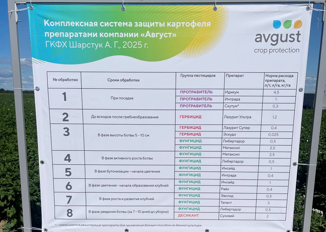 Менеджер-технолог красноярского представительства «Августа» Александр Рябцев продемонстрировал результаты комплексных обработок картофеля и кукурузы. Для защиты клубней использовали протравители Идикум, Интрада и Синклер, по вегетации посадки картофеля обрабатывали гербицидами Лазурит Ультра и Эскудо® и фунгицидами Метаксил (с адъювантом Полифем), Инсайд, Интрада и Раёк. Специалисты планируют обработку против болезней Либертадором и десикацию препаратами Сахара и Суховей.