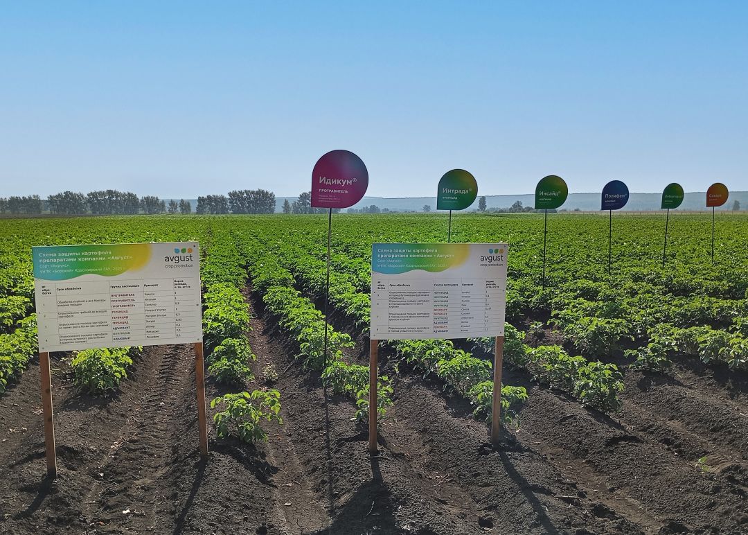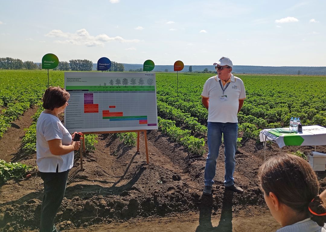На следующий день слушатели курсов посетили учебно-научно-производственный комбинат «Борский» Сухобузимского района, где менеджер-технолог представительства «Августа» в Красноярске Александр Рябцев, Андрей Чураков и Владимир Барков продемонстрировали опытные посадки картофеля с «августовской» защитой.
